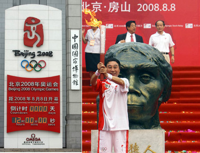 A combo photo shows an Olympic countdown clock (L) reading just the day of the opening of the 2008 Beijing Olympic Games on Tian'anmen Square and Chinese comedy Feng Gong lifting the Olympic torch during the last day of the Beijing relay in Zhoukoudian in Fangshan District of Northwest Beijing August 8, 2008. [Xinhua]