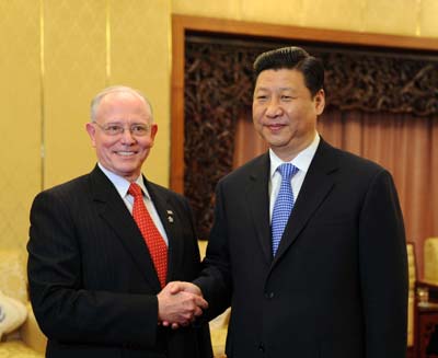 Chinese Vice President Xi Jinping (R) shakes hands with James Peake, the head of US presidential delegation to the Beijing Paralympics, Beijing, September 8, 2008. [Xinhua]