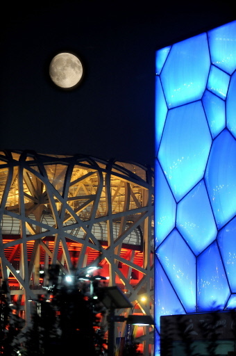 | A nearly full moon over the National Stadium or better known as the Bird's Nest in Beijing on early September 14, 2008, which is now hosting the athletic competition for the 2008 Beijing Paralympic Games. Paralympians in Beijing will get a taste of China's Mid-Autumn Festival, which falls on September 14 this year. [Agencies] |