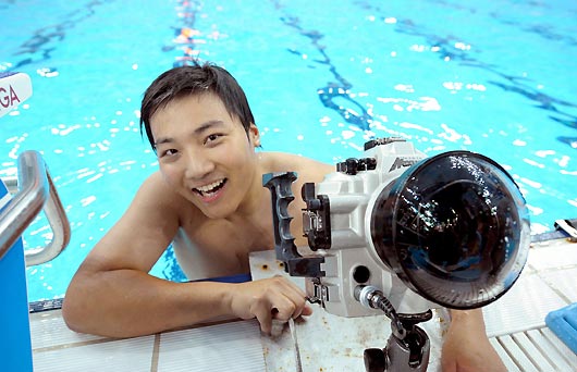A photojournalist takes an underwater camera out of the water in the pool of the National Aquatics Center, or the Water Cube, in Beijing, China, Sept. 15, 2008. The "Water Cube" finished hosting all its swimming events on September 15, 2008. [Xinhua]