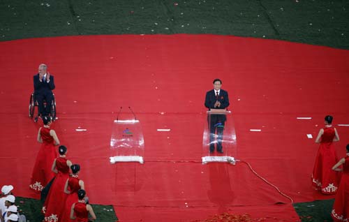 Liu Qi (C), chief organizer of the Beijing 2008 Paralympic Games addresses to the closing ceremony of the Games in the National Stadium September 17, 2008. [Xinhua]