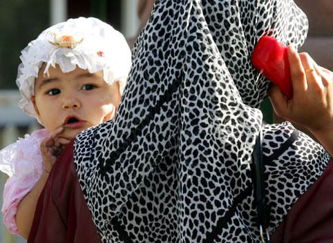 A muslim woman phones while holding her child at a street in Urumchi,northwest China's Xinjiang Uygur Autonomous Region in July 2006.[Chen Hui]
