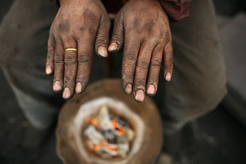 A coal yard worker in Korla warms her hands. [Photo by Natalie Behring]