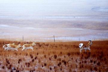 "My view of photography is a combination of 30 percent o passion, 30 percent reason, 30 percent perseverance and ten percent indifference to fame or gain," said Ge. Now he has a collection of over 30,000 pictures that covered each kind of bird there. As a well-known environmental protection activist, he focuses his attention on the protection of China's only endemic antelope, the Procapra Przewalskii, at Qinghai Lake, China's largest inland saltwater lake in the northwestern province of Qinghai. Procapra Przewalskii, named after Russian naturalist Przewalskii, is a very attractive variety of highland antelope. "In November 1997, I took pictures of seven antelopes as they were running and became the first to capture this animal with a camera in Qinghai Province," said Ge. In the following years, he continued to study and photograph them, and exchanged ideas with experts from universities and research institutes, such as the Chinese Academy of Forestry. He said "based upon my ten year- track record, I found that the animal had to compete with domesticated goats and sometimes they were forced to live in the deep desert, where the wide wolves are a large threat."