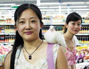 Miss Huang, with a pigeon on her shoulder, shops in a supermarket in Qingdao, East China's Shandong Province August 2, 2007. The bird is seen with her wherever she goes. Huang, who works for a hotel in Qingdao, found the sick pigeon about a month ago in the hotel storehouse and fed it until it gets well. [Sina.com.cn]