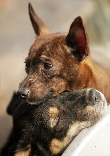Two dogs adopted by Fang Jiangxue enjoy the sunshine on a sunny winter day. [newsphoto]