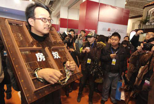 Action artist Liang Kegang (L-1) performs action art at the 9th China International Real Estate & Archi-Tech Fair (CIHAF) in Beijing on December 11, 2007. [cnsphoto]