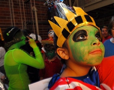 Savannah Sanchez, dressed as the 'Star Spangled Alien from the Planet Yankee Doodle', waits backstage prior to the costume contest at Pearson Auditorium during the UFO Festival on Saturday July 5, 2008 in Roswell, N.M. [Agencies]