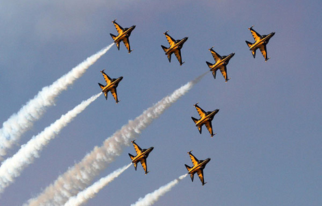 Airplanes stage an air show in Seongnam, South Korea, Oct 18, 2011. The 2011 Seoul International Aerospace and Defense Exhibition kicked off in Seongnam city on Tuesday. [Photo/Xinhua]