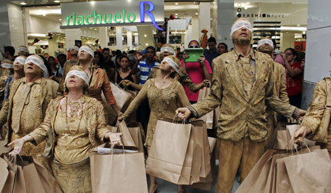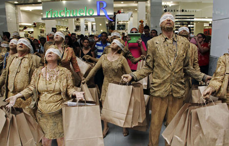 World Cup mascot Fuleco strikes a pose on stage in Hangzhou, East China's Zhejiang province, Dec 9. Fuleco, which officially debuted in China, is a cartoon design of an armadillo, an endangered species. The 2014 World Cup finals will be held in Brazil from June 12 through July 13. [Photo by Li Zhong/Asianewsphoto]