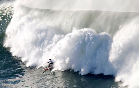 A surfer rides a wave during the Punta Galea Big Wave Challenge in Punta Galea, northern Spain, December 22, 2013. The best big wave riders in the world battled on Sunday against six local wildcards from Spain's Basque Country region at Punta Galea, located 15 kilometres from Bilbao. American surfer Grant Baker won the competition. [Photo/Agencies]