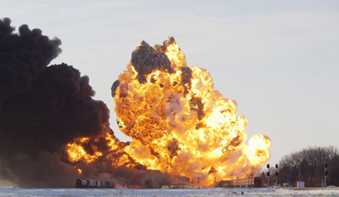 A massive fireball from an exploding train car rises into the air in North Dakota, US, Dec 30, 2013. At least ten cars on the 106-car train burst into flames after derailing.[Photo/icpress.cn]
