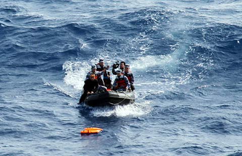 Crew from Chinese navy ship Jinggangshan found a life vest in the area where Malaysia Airline flight MH 370 may have crashed, Mar 11, 2014. The vessel had begun the search the previous day. Jinggangshan, with a crew of 1,000 and loaded with underwater detection equipment, is hunting in tandem with Chinese navy frigate Mianyang, which had arrived on Monday. [Photo/navy.81.cn]