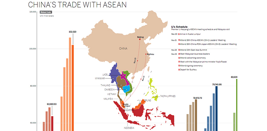 2015-11-20Editor's note: From poverty reduction and railway construction projects to political and trade cooperation, relations between China and the Association of Southeast Asian Nations have developed rapidly. China Daily looks back at the milestones along the road to regional prosperity as Premier Li Keqiang attends a series of meetings in Kuala Lumpur.