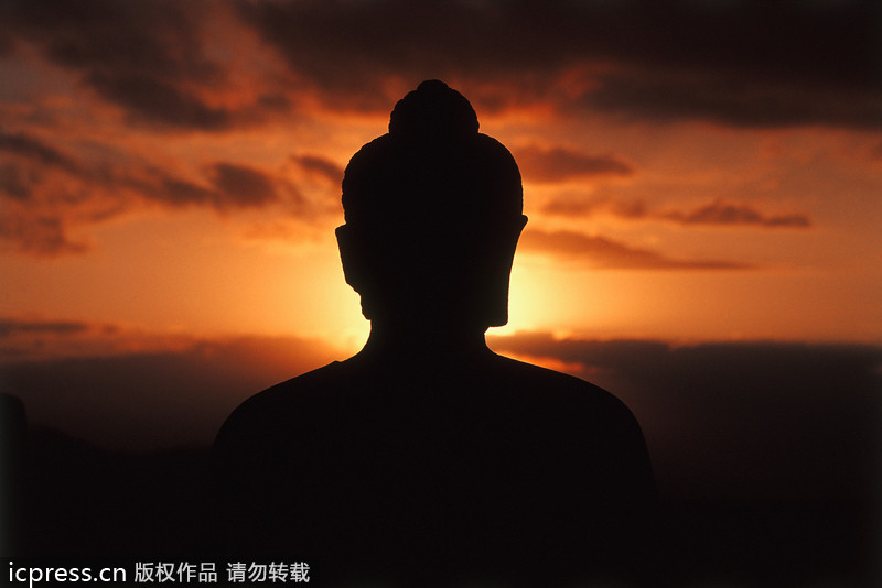 Top five: Indonesia, Java, Buddha figure at Borobudur temple at sunrise, silhouette. [Photo/icpress.cn]