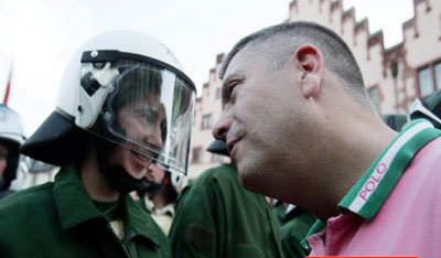 English soccer fans react after German riot police prevented them from moving in a street after they pelted police with bottles at the Roemerberg square in downtown Frankfurt June 10, 2006. [Reuters]