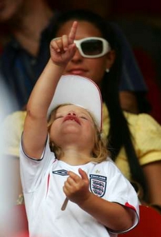 Romeo Beckham, son of England's David Beckham and his wife Victoria, gestures in the stands before Trinidad and Tobago's Group B World Cup 2006 soccer match against England in Nuremberg June 15, 2006. [Reuters]