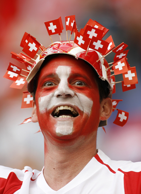 A Switzerland fan waits in the stands before the Group G World Cup 2006 soccer match between South Korea and Switzerland in Hanover June 23, 2006. [Reuters]