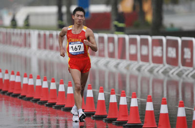 Battling in a pouring rain and strong wind, the 28-year-old Chinese, bronze medalist at the World Cup this year, broke away from the leading pact at the 10km mark, and led the way all home for a big way. The silver medal was won by South Korea's Kim Hyun-Sub in 1:23: 12, and the bronze went to Japan's Koichiro Morioka, 1:23:17. After the gun, Han, gold medalist of the Asian Championships in 2003, jumped to the leading position immediately, followed closely by the South Korean and Japanese walkers. The first 8 kilometers saw the three walkers stay together and rolling ahead in a leading group. But Han quickened his pace in the next lap and built up his big lead in the later stage. Kim and Morioka fought for the silver hard in the rain, walking shoulder by shoulder to the finish.