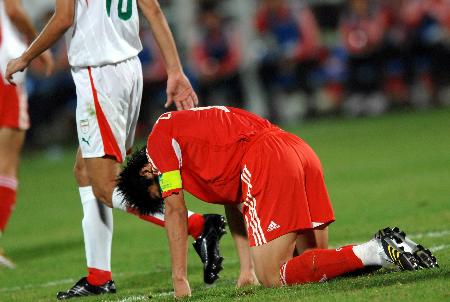 China's Zheng Zhi reacts after missing a penalty kick during the men's quarter-final soccer match against Iran at the 15th Asian Games in Doha December 9, 2006. [Xinhua]