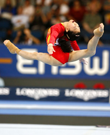 Jiang Yuyuan of China performs her routine during the team event at the 40th World Artistic Gymnastics Championships in Stuttgart September 1, 2007. [Xinhua]