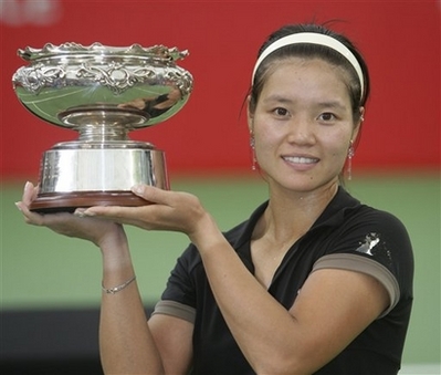 Li Na of China holds the winner's trophy after her final game against Victoria Azarenka at the Australian Women's Hardcourt Championships on the Gold Coast, Australia, Saturday, Jan. 5, 2008. Li went on to win the match 4-6, 6-3, 6-4. [Agencies]