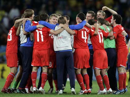 Russia, who had never beaten Sweden in their five previous meetings spanning 95 years, had to win to progress while a draw would have been enough for the Scandinavians to advance. But there was only one team in it from the start as brilliantly-worked goals by Roman Pavlyuchenko and Andrei Arshavin sent the Russians into the knockout phase of a major tournament for the first time since, as the USSR, they lost to the Dutch in the final of Euro 1988. The inclusion of Arshavin, suspended for the first two games, seemed to give Russia a massive injection of self-belief and they were unrecognisable from the side who laboured to victory over Greece and were thumped by Spain. His direct running and some confident, slick passing in and around the box had Sweden hanging on from the opening exchanges. Yuri Zhirkov sounded a warning when he drove a volley wide after 21 minutes and three minutes later Russia were ahead. A clever pass enabled Konstantin Zyryanov to escape down the right and he played the ball inside to Alexander Anyukov. The dangerous midfielder then rolled it into the path of Pavlyuchenko who cracked home a first-time shot. The striker almost had another later in the half when he fired against the bar after another neat exchange. The Swedes issued a reminder of their own threat on the break as Henrik Larsson looped a header against the bar and Mikael Nilsson forced a sharp smothering save out of Igor Akinfeyev at the end of the half. It proved a key intervention as five minutes after the break Arshavin doubled the lead with another superb goal. An attack that began deep in their own half ended with Zhirkov setting up the playmaker to score with his outstretched right boot. |