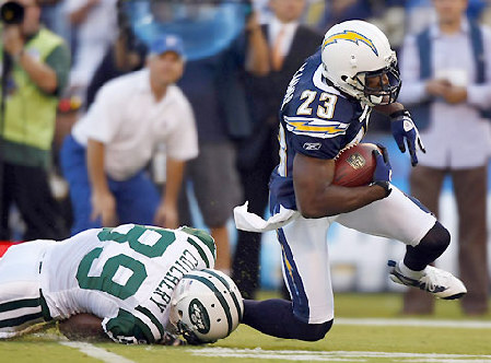 San Diego Chargers Quentin Jammer (R) is brought down by New York Jets Jerricho Cotchery after he recovered a fumble during the first quarter of their Monday Night NFL football game in San Diego, California September 22, 2008. [Agencies]