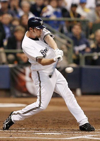 Mike Cameron and Bill Hall, two free-swinging Brewers, walked with no outs in the first against Jamie Moyer, known for his control. Both runners moved up on a wild pitch before Fielder hit a sacrifice fly to right with one out.