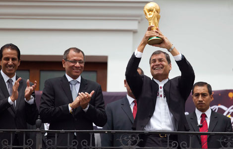 Correa, an avid football fan, stood on a balcony at the presidential palace of Carondelet in the capital Quito, and raised the trophy above his head during the traditional military change of guard held every Monday.