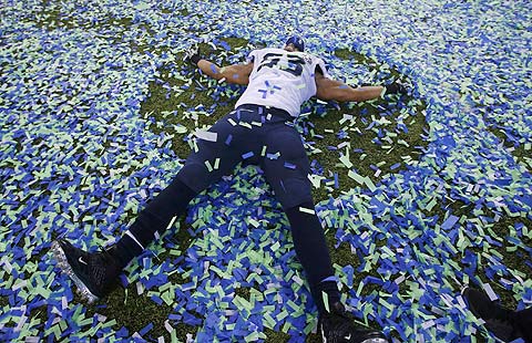 Seattle Seahawks Michael Robinson (L) breaks free of Denver Broncos Paris Lenon in the first quarter in the NFL Super Bowl XLVIII football game in East Rutherford, New Jersey, February 2, 2014. [Photo/Agencies]