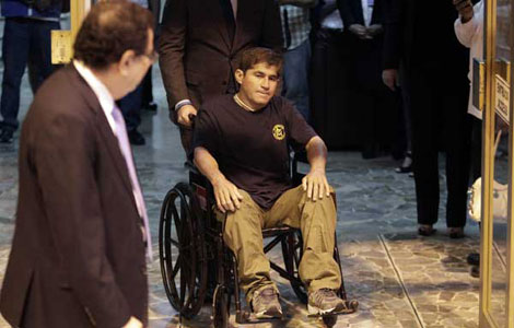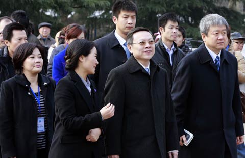 China's skip Liu Rui delivers a stone as lead Zang Jialiang and second Ba Dexin look on to sweep ahead of it during their men's curling round robin game at the 2014 Sochi Olympics in the Ice Cube Curling Center in Sochi February 12, 2014. [Photo/Agencies] |
