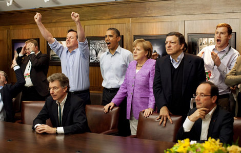 G8 leaders watch the overtime shootout of the Chelsea vs. Bayern Munich Champions League final in the Laurel Cabin conference room during the G8 Summit at Camp David, Maryland.