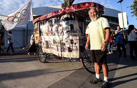 Chen Guanming shows how he turns his pedicab into a tent on July 31.