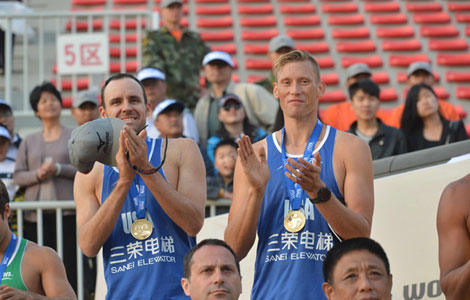 Jake Gibb and Casey Patterson of the United States won an entertaining blocking battle against Brazil's Pedro Solberg Salgado/Bruno Oscar Schmidt in the final to claim their first FIVB Beach Volleyball World Tour title together at the Shanghai Grand Slam Saturday afternoon.