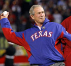 Former US President George H.W. Bush (R) watches as his son, former US President George W. Bush, throws a ceremonial first pitch prior to the start of Game 4 of Major League Baseball's World Series between the San Francisco Giants and the Texas Rangers, in Arlington, Texas, Oct 31, 2010.