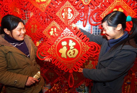 Two women select New Year decorations at a wholesale market in Yiwu, east China's Zhejiang province January 5, 2009. Chinese people are busy buying "New Year necessities" - special purchases for the Spring Festival - and decorations in preparations for get-togethers during the traditional Chinese festival, which starts on January 26 this year according to Chinese lunar calendar. [Xinhua]