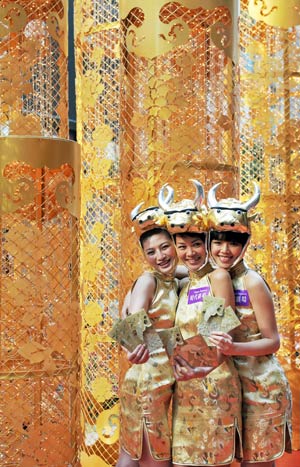 Three models in costumes of Ox pose at a shopping mall in Hong Kong, South China, Jan. 14, 2009. The shopping mall was decorated to attract customers before Chinese lunar new year, the year of Ox. [Xinhua]