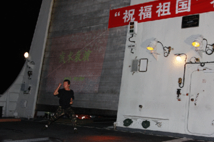 A Chinese naval soldier performs Wushu (martial arts) during a Lunar New Year party on the deck of destroyer Haikou, which is on escort mission around pirate-ridden Somalian waters. The Chinese naval vessels have so far carried out six escort missions for 16 ships off Somalian coast. [chinadaily.com.cn/Wang Hui]