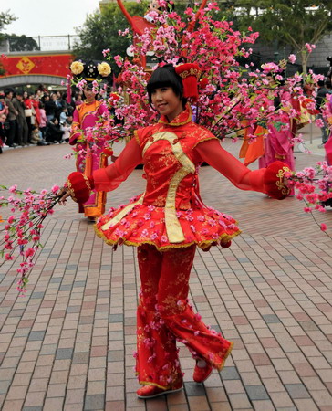 ![]() Actresses in traditional costumes dance at the Disneyland in Hong Kong in celebration of the Chinese Lunar New year, Monday January 26, 2009. Spring Festival, or the Chinese Lunar New Year, is the most important traditional Chinese festival that calls for family reunion. It falls on Jan. 26 this year.[Xinhua]
