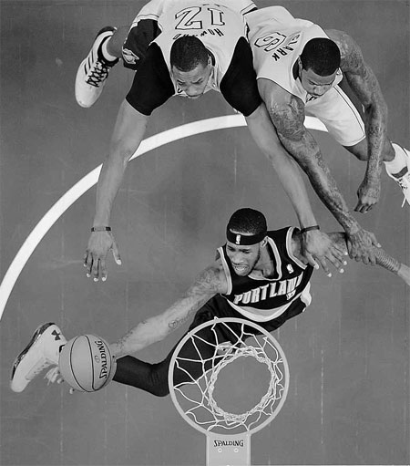 Portland's Will Barton puts up a shot as the Lakers' Dwight Howard (left) and Earl Clark defend during LA's 111-107 win on Friday. Mark J. Terrill / Associated Press |