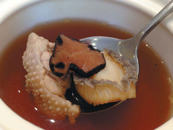 This savory scent is again accentuated in a chicken and abalone soup, where truffle slices are added in the final half hour of simmering to bring out its full fragrance. Yunnan chicken is known for its flavor, so when you add a whole fresh abalone and truffles, you can be sure the consomm is a winner.