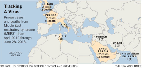 The disease, Middle Eastern respiratory syndrome, or MERS, is caused by a coronavirus, a relative of the virus that caused severe acute respiratory syndrome, or SARS, which originated in China and caused an international outbreak in 2003 that infected at least 8,000 people and killed nearly 800.
