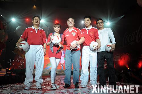 4月13日,歌手張靚穎(左二)與足壇名宿容志行(左一)等在發(fā)布儀式上。當(dāng)日,南非世界杯全球合作伙伴可口可樂國語版主題曲《旗開得勝》在深圳發(fā)布。新華社記者劉大偉攝