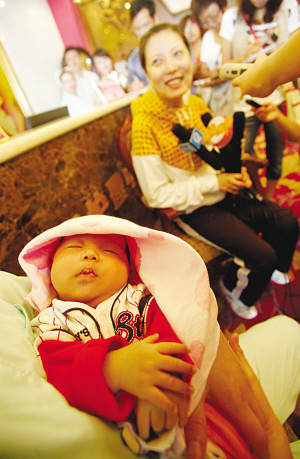 杜麗透露,愛子的小名是maomao(音),大名還沒定。小家伙或許從來沒見過這么熱鬧的場面,烏溜溜的眼睛打量著四周,但很快還是在媽媽的懷抱中甜甜睡去。抱著愛子的杜麗充滿了慈愛,一臉的幸福之情。這個即將滿月的孩子是中國第一對奧運會冠軍夫妻產(chǎn)下的“冠軍之子”,正如杜麗所言,他長得比較像母親一些。