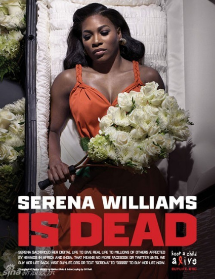 這項活動最早是由歌手阿麗茜亞·凱斯發(fā)起,活動主題命名為“贖命(Buy Life)”,諸多大牌明星躺進棺材,暗示自己已經(jīng)在虛擬世界進入了數(shù)字化死亡(digital deaths)。在為小威拍攝的照片中,配上了紅色醒目標題“塞雷娜死了”。此次義務宣傳由阿麗茜亞·凱斯慈善機構(gòu)“讓孩子們活下去”舉辦,希望能通過這種方式引起大家對暫時還無法治療的艾滋病的深刻認識,并且?guī)椭诜侵藓陀《日谠馐馨滩≌勰サ暮⒆?、家庭,籌集更多的醫(yī)療救助善款。