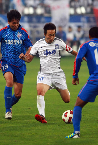 10月19日,天津泰達隊球員王新欣(中)在比賽中。 當(dāng)日,在2011中國足協(xié)杯半決賽中,天津泰達隊主場以2比0戰(zhàn)勝上海申花隊,晉級決賽。 新華社記者 岳月偉 攝