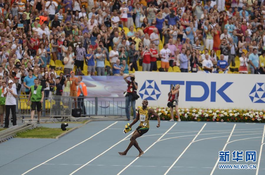 8月18日,牙買加隊選手博爾特光腳跳舞,慶祝奪冠。當日,在俄羅斯莫斯科舉行的2013年國際田聯(lián)世界田徑錦標賽男子4X100米接力決賽中,牙買加隊以37秒36的成績奪得冠軍。新華社記者李俊東攝