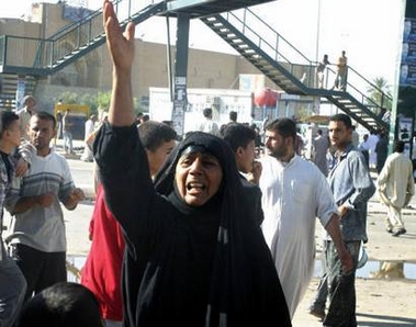 An Iraqi woman gestures at the site of an explosion in Kufa July 18, 2006. A suicide bomber pulled his minivan into a busy market on Tuesday, lured labourers onboard with the promise of jobs and then blew himself up, killing at least 59 people in one the bloodiest attacks in Iraq this year. [Reuters]