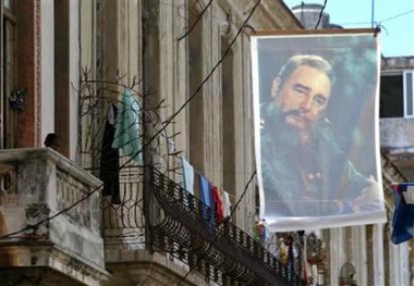President Fidel Castro hangs in between buildings in Havana, August 6,